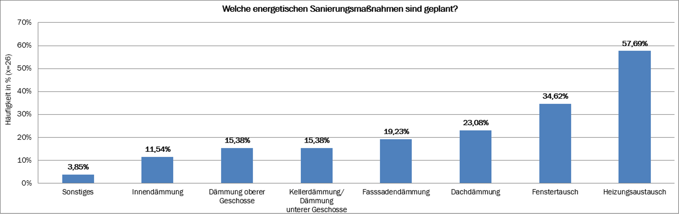 Das zugehörige Diagramm veranschaulicht die von den Befragten in den kommenden Jahren geplanten Maßnahmen zur energetischen Sanierung – dargestellt in Prozentanteilen. Am häufigsten genannt wurde der Austausch der Heizungsanlage mit 57,69 %, gefolgt vom Austausch der Fenster (34,62 %) sowie der Dachdämmung (23,08 %). Weitere geplante Maßnahmen sind die Fassadendämmung (19,23 %), die Dämmung der obersten Geschossdecke (15,38 %) sowie die Keller- bzw. Geschossdämmung nach unten (ebenfalls 15,38 %). Die Durchführung einer Innendämmung wurde von 11,54 % der Teilnehmenden angegeben. Unter der Kategorie „Sonstiges“ wurden 3,85 % der Maßnahmen eingeordnet.