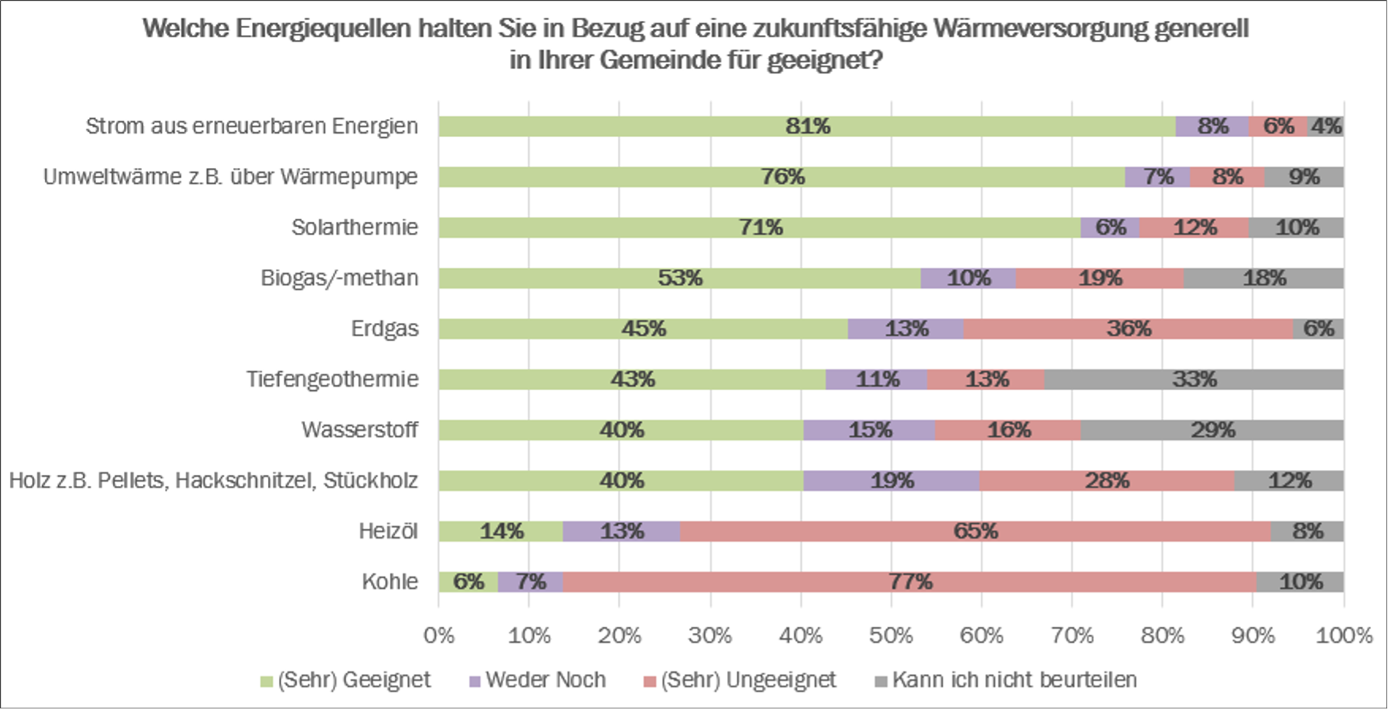 - Strom aus erneuerbaren Quellen (81 %), Solarthermie (71 %) sowie Umweltwärme – beispielsweise durch den Einsatz von Wärmepumpen (76 %) – wurden mehrheitlich als geeignet oder sehr geeignet bewertet.