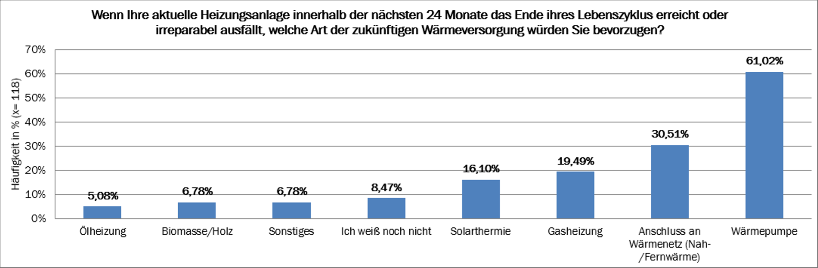 Die Teilnehmenden hatten zudem die Möglichkeit, anzugeben, welche Art der Wärmeversorgung sie bevorzugen würden, falls ein Heizungsaustausch innerhalb der nächsten 24 Monate unvermeidlich wäre. Dabei waren Mehrfachantworten zulässig.